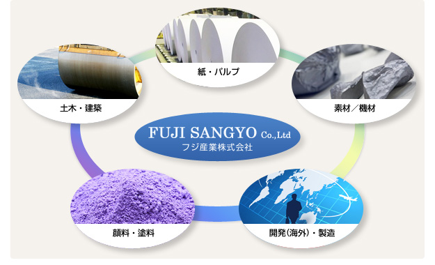 弊社の事業構成は、紙・パルプ、土木・建築、顔料・塗料、開発(海外)・製造、素材/機材